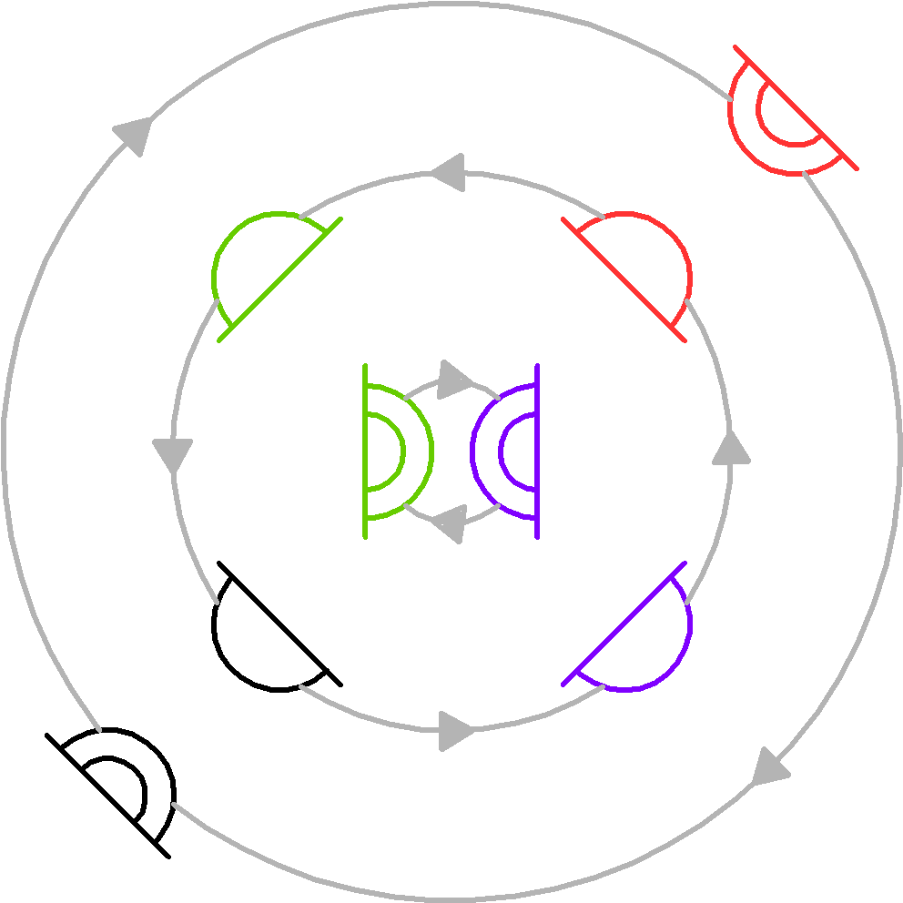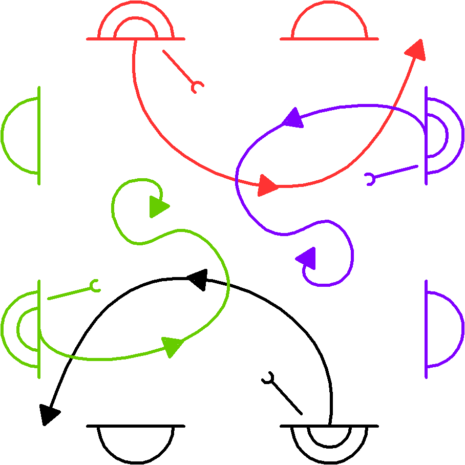 Такты 1-4. На 6 dCt+As все пары в открытой позиции вращаются по часовой стрелке (кавалеры идут вперед, дамы — чуть назад). При этом главные пары вращаются на 1.5 оборота, а боковые — на один.